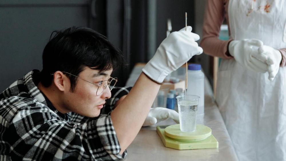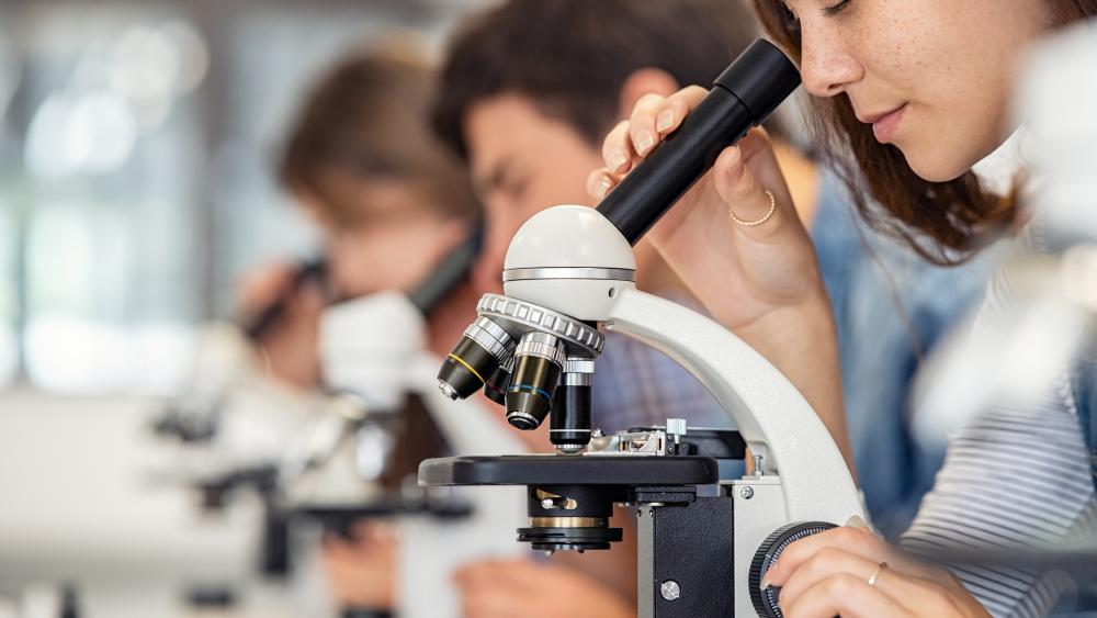 two students in lab coats in a laboratory