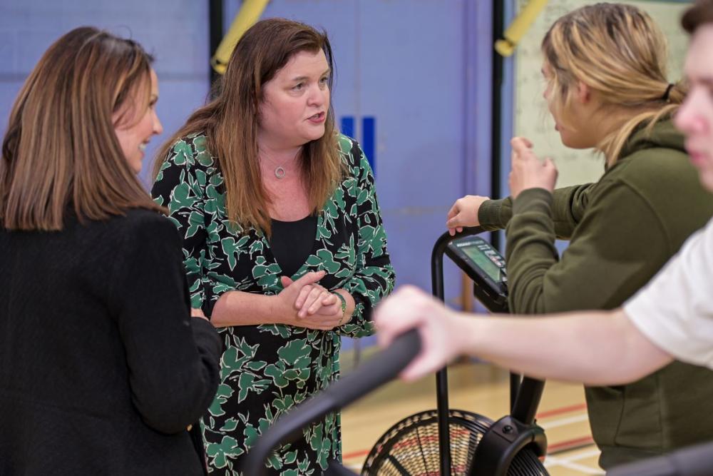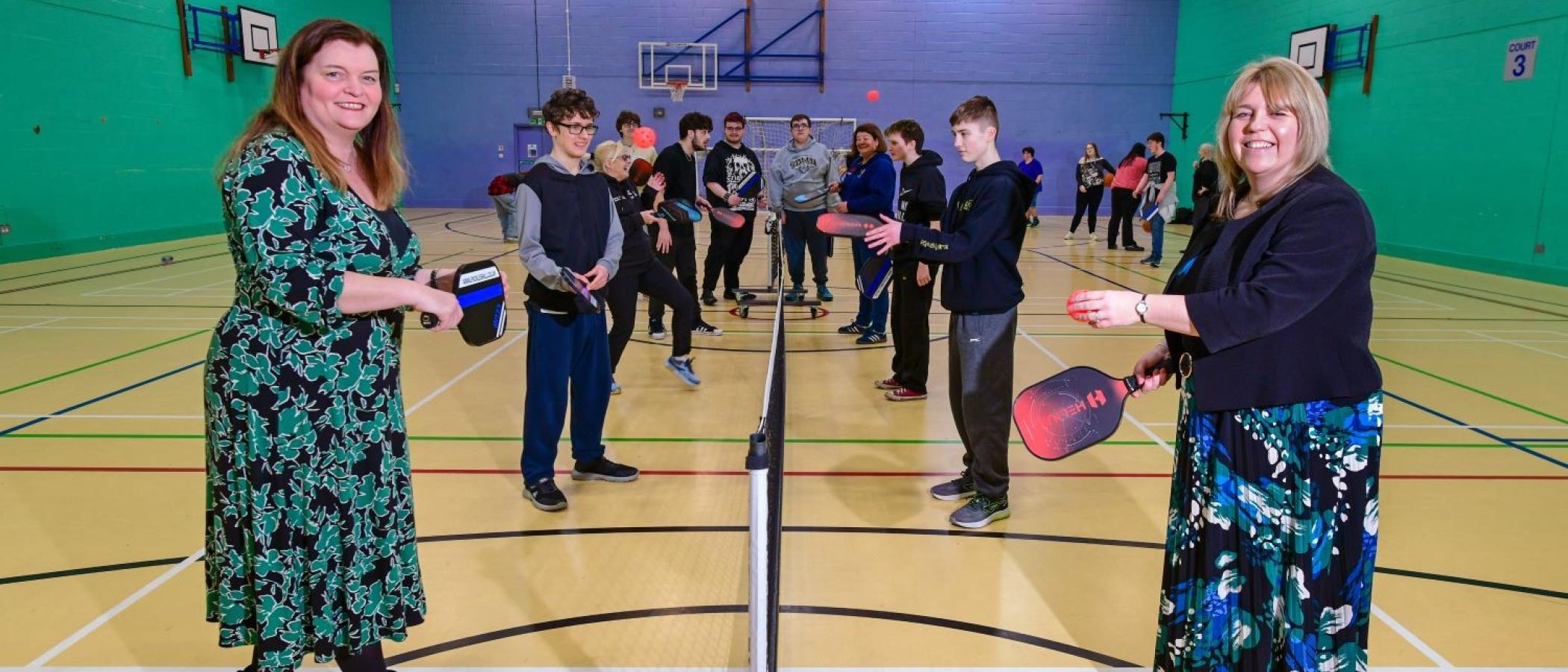 Yng nghwmni’r Pennaeth Kelly Fountain, galwodd Sioned heibio i Ganolfan Chwaraeon y Coleg lle mwynhaodd hi ambell gêm o bêl-picl gyda myfyrwyr SBA y flwyddyn gyntaf fel rhan o’u cwricwlwm Lles Actif.