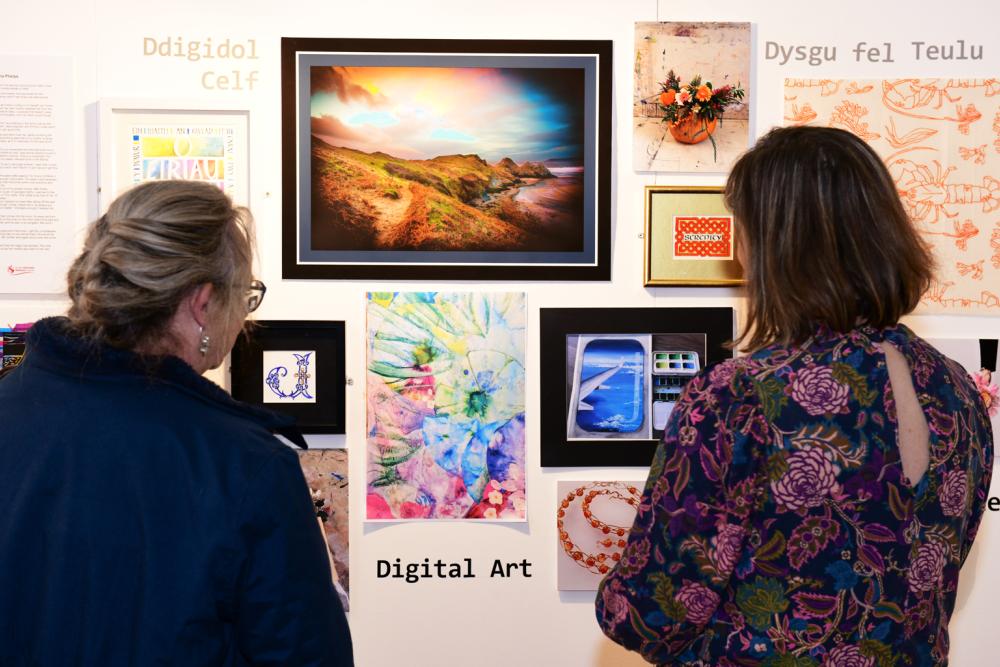 Cafodd ymwelwyr gyfle i sgwrsio â myfyrwyr gan ddysgu am y gwaith celf a oedd yn hongian ar waliau Neuadd Siôr yn Neuadd Brangwyn. Cyflwynwyd yr holl waith a arddangoswyd gan oedolion sy’n dysgu ar draws Abertawe.