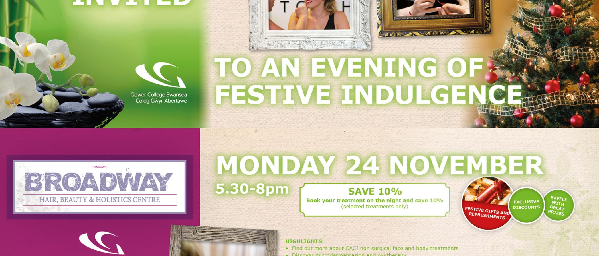 Spoil yourself at our upcoming Evening of Festive Indulgence at the Broadway Hair, Beauty and Holistic Centre Monday 24 November - live demos, free taster treatments, gorgeous Christmas gift ideas... 5.30pm - 8pm