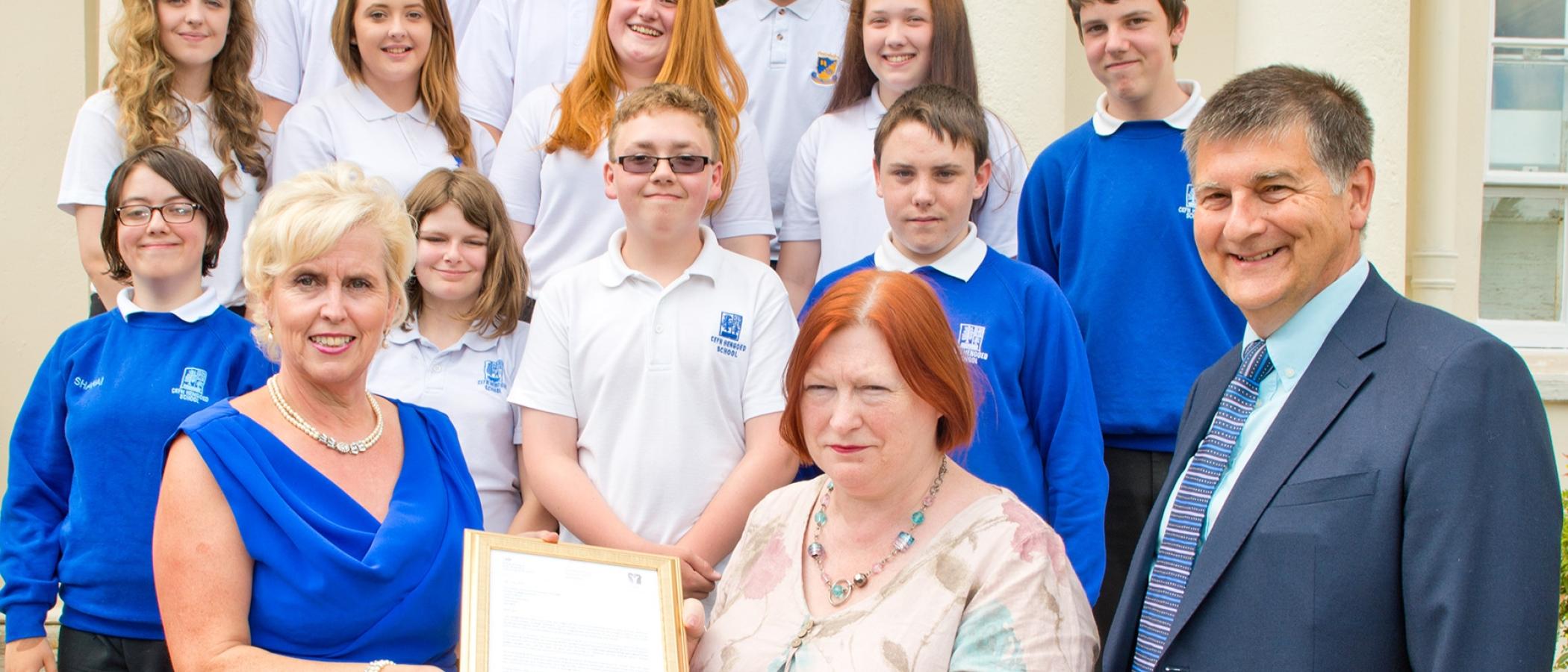 Photo: A Primary to Professional event held at Sketty Hall in 2014 - Sue Poole is pictured (left) with Edwina Hart AM, Cllr Mike Day and local school pupils.