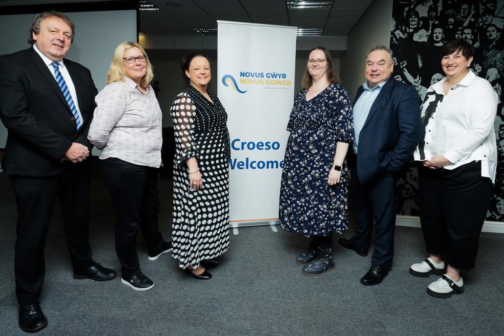 Left to right: Mark Jones, CEO Gower College Swansea, Sian Hibbs, Deputy Director Strategic Support, Admin and Assurance HM Prison and Probation Service, Louisa Walters, Quality Development Manager Gower College Swansea, Sally Pearson, Head of Learning and Skills Novus Gower, Peter Cox, Managing Director Novus and Donna Whitehall, Contract Manager HM Prison and Probation Service