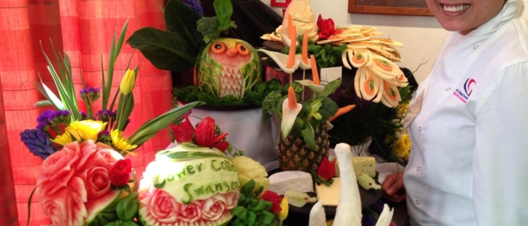 All delegates at the conference were left in awe following two live demonstrations, where Wan created an array of decorative pieces including an ‘underwater scene of fish and seahorses’, an exquisite ‘rose bouquet complete with college logo’ from a watermelon, a ‘poodle’ made from broccoli, an aubergine ‘penguin’, a ‘peacock’ made from Swede and carrots, while not forgetting the fabulous ‘strawberry and pak choi blooms’ that were displayed in a vase made of pineapple!