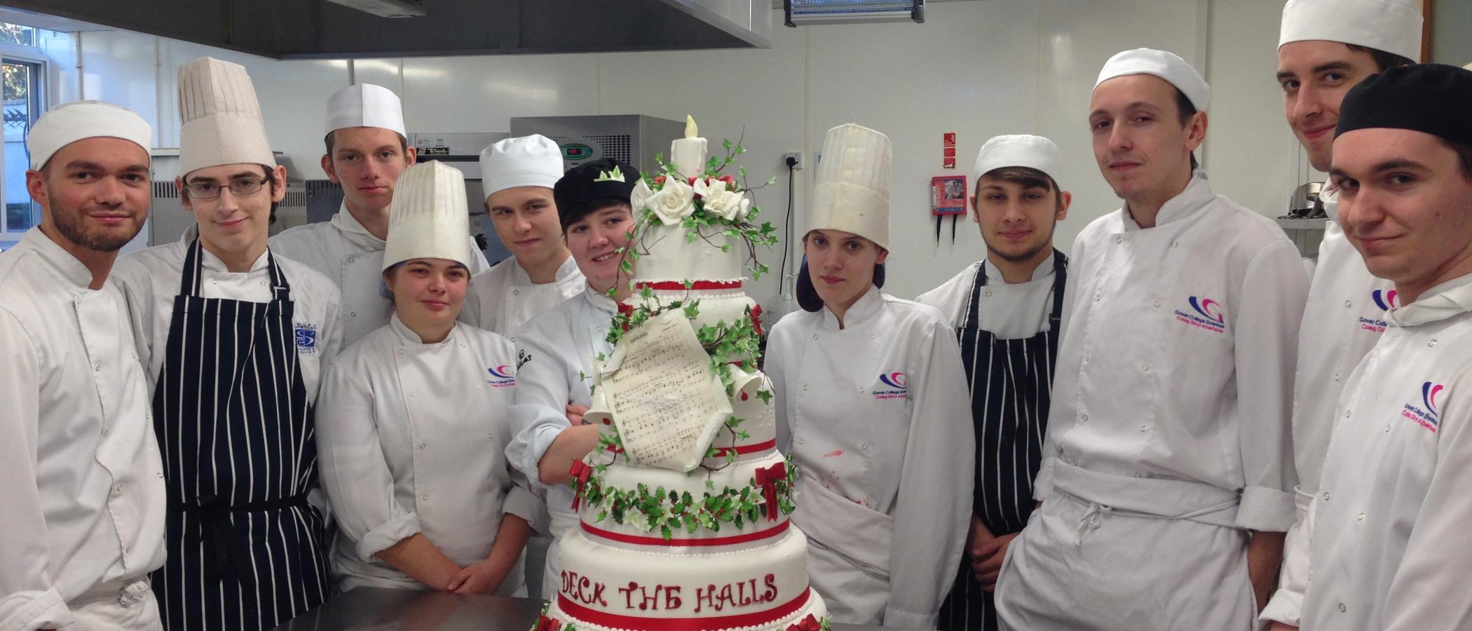 Level 3 Patisserie students have created their annual centerpiece, this year aptly named ’Deck the Halls’. The striking six tier cake was carefully decorated with garlands of edible holly, ivy and roses.